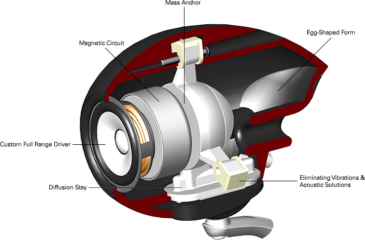 The internal standing and diffraction waves generated at the front baffle edges are largely eliminated by adopting a rigid yet tactile egg-shaped form, in which no two radial surfaces are in the same plane.